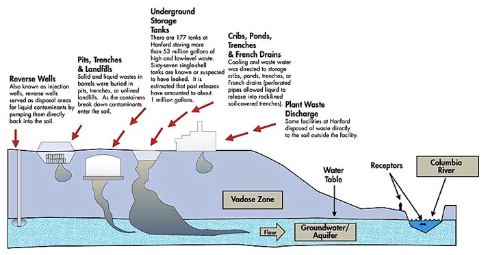 Groundwater at Hanford is severely contaminated with hazardous and radioactive chemicals, such as chromium, strontium-90, and other pollutants. Polluted groundwater from Hanford seeps into the Columbia River in the Hanford Reach. Federal and state agencies are undertaking major efforts to prevent the movement of contaminated groundwater to the Columbia River.
