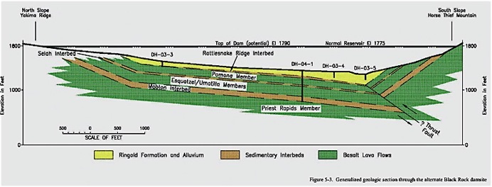 “Thrust fault” just beneath the proposed Black Rock Dam. source: U.S. Bureau of Reclamation, Summary Report: Appraisal Assessment of the Black Rock Alternative. A component of Yakima River Basin Water Storage Feasibility Study, Washington. Technical Series No. TS-YSS-7 Return to Unstable Geology.