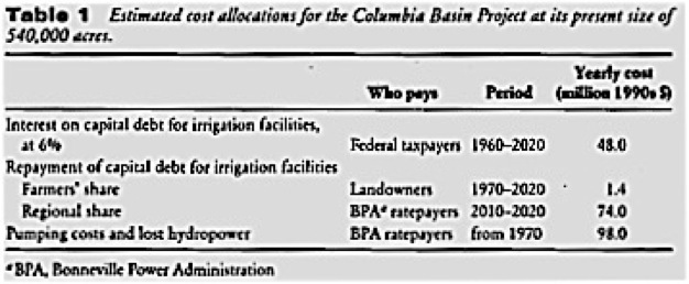 This table shows a breakdown of CBP subsidies in 1990 dollars. The CBP is the largest federally-run irrigation project in the United States. Massive subsidies are required to pump water to CBP irrigators, including taxpayer support for the cost of the project and Bonneville Power ratepayer subsidies for the energy it takes to pump water from Lake Roosevelt into Banks Lake.