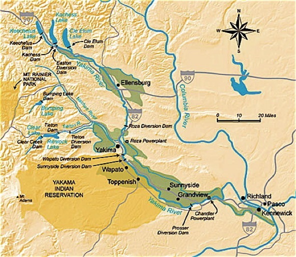 In 2002, the Yakima Water Resources Agency issued an analysis of the Yakima River Basin Water Enhancement Project (YRBWEP) conservation plans. The study estimates that 14 irrigation districts in the basin could save up to 540,000 acre-feet of water at a cost of about $400 million. Another 95,000 to 178,000 acre-feet could be saved through on-farm efficiency programs. Most of the Yakima water conservation projects remain under-funded and largely unimplemented. Click here to enlarge (map source: U.S. Bureau of Reclamation)